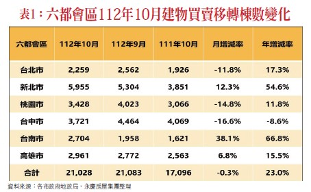 根據六大都會區分別公布今年十月「建物買賣移轉棟數」,交易量合計為21,028棟。永慶房屋研展中心副理陳金萍說明,由於房市交易與登記約莫有一個月左右的時間差,因此十月建物買賣移轉棟數主要是反映九月至十月初的市況,十月六都建物買賣移轉棟數月減0.3%(表一)。