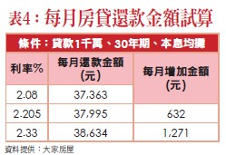 郎美囡指出,五大銀行今年九月平均房貸利率為2.08%,若貸款一千萬、三十年期,並以本息均攤的方式還款,每個月房貸還款金額為37,363元,若升息半碼,推算利率上升為2.205%,每月還款金額增加632元,但若升息一碼,利率來到2.33%,每月還款金額增加1,271元,對薪資不高的上班族來說壓力不小(表四)。