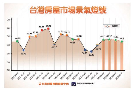 預測第四季景氣指標分數為46.52,2024年第一季與第二季景氣指標分數分別為45.81與44.10,雖仍有波動,但皆位於景氣穩定的綠燈區域,顯示在「剛需撐盤,內需溫和」的格局下,房市發展保持穩健步調。