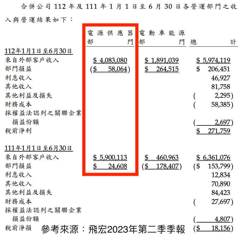 首先是電源供應器部門,這就是飛宏的本業,從外部客戶收入來看,2022年上半年是59億元,2023年上半年則衰退到40.83億元,因此部門損益出現轉盈為虧,從獲利2460.8萬元變成虧損5806.4萬元。