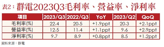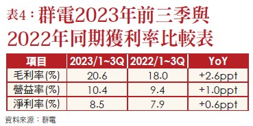 群電2023年前三季在毛利率、營益率、淨利率,分別為20.6%、10.4%、8.5%,都比2022年數字(18.0%、9.4%、7.9%)優(參見表四) ,呈現三率三升的現象。
