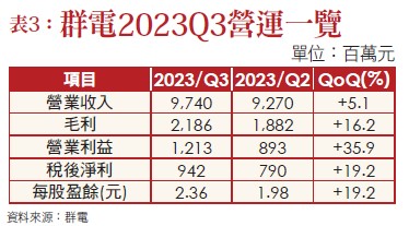 群電2023年Q3在毛利率、營益率、淨利率,都比今年Q2和2022年Q3還要好,呈現三率三升的現象(表二)。