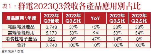 2023年Q3總營收97.40億元,營收占比依據產品應用別,2023年Q3各個「產品應用別」占比如表一。