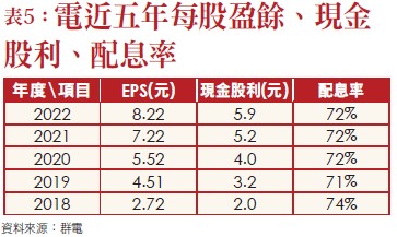 群電過去五年每股盈餘、現金股利、配息率如表五,今年前三季EPS已達5.81元,預期今年盈餘仍將順利配息。