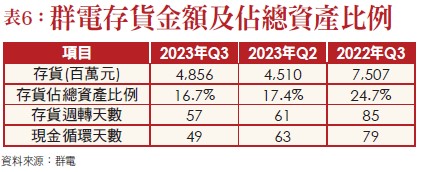 群電自2022年Q2起嚴格控管庫存,讓存貨金額逐步降低,從2022年Q3的75億元,到2022年底調降到65億元,2023年Q2已降到45億元(表六)。2023年6月底客戶有明顯的拉貨現象,顯示客戶端庫存清理有比較明顯的進展。