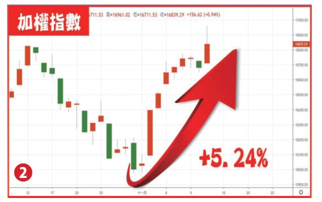 美國四大指數十一月初至11/10表現,道瓊指數上漲1230點漲幅3.72%、NASDAQ上漲946點漲幅7.37%、S&P500上漲221點漲幅5.28%、費城半導體上漲375點漲幅11.69%(詳圖一),造就科技類股漲勢驚人主因就是公債殖利率自高點滑落(以十年期公債殖利率來說由5.02%高點下跌至4.62%)。同期台股加權指數上漲838點漲幅5.24%(詳圖二),櫃買指數上漲8.65點漲幅僅4.13%,顯示本波行情係由大型權值股發動上攻,投資人可期待下波中小型股落後補漲的表現!