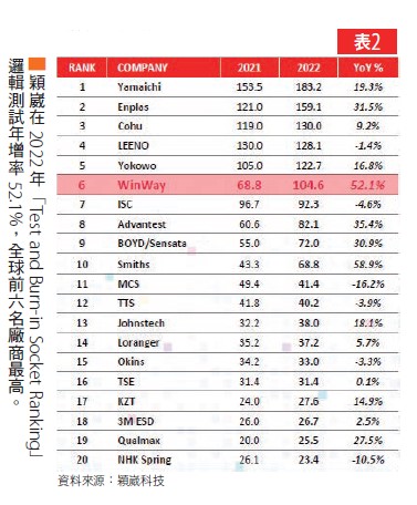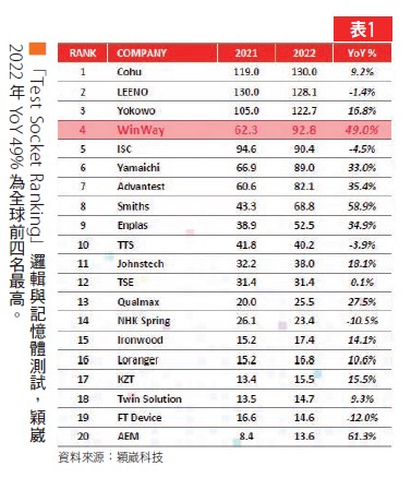 「Test Socket」做邏輯跟記憶體部分是全球排名第四。在前四名中以穎崴的年增率(YoY)49%為最高(參見附表一)。