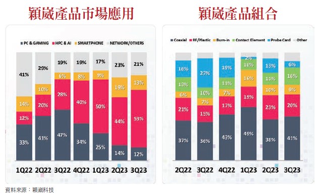 產品應用面在終端市場屬於AI、HPC的占比大幅提高,從2022年第三季的28%占比,大幅成長到2023年第三季已達到53%。