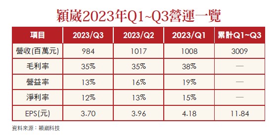 2023年第一季到第三季毛利率維持在35%以上,毛利率受到產品組合以及匯率影響,第三季高毛利率探針卡營收占比減少,毛利率仍舊維持在35%。