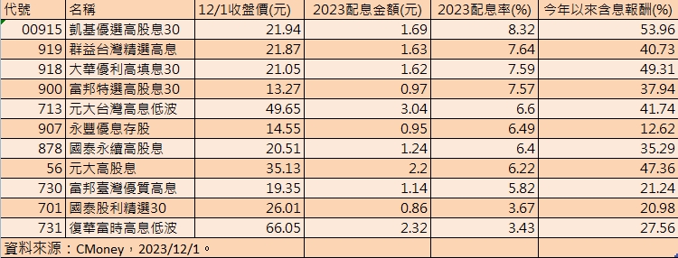若以宣告配息金額的12月1日收盤價概算,全年度配息率前五名則為凱基優選高股息30(00915)、群益台灣精選高息(00919)、大華優利高填息30(00918)、富邦特選高股息30(00900)、元大台灣高息低波(00713);進一步觀察今年以來含息總報酬,前五強為凱基優選高股息30(00915)、大華優利高填息30(00918)、元大高股息(0056)、元大台灣高息低波(00713)、群益台灣精選高息(00919)。
