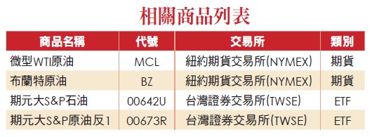 如投資人想參與原油行情可選擇紐約期貨交易所的微型WTI原油期貨(MCL)以及布蘭特原油(BZ)進行波段操作。偏好低槓桿投資商品可參考國內ETF,如期元大S&P石油(00642U)。若有避險需求,害怕價格持續下跌導致虧損,也可參考期元大S&P原油反1(00673R)進行反向操作,於市場震盪情境下,對沖下跌風險,達成多空雙向靈活布局。