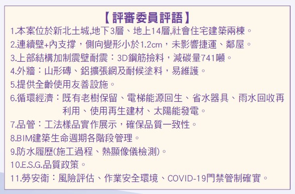 3.高品質施工:嚴格遵循公共工程三級品管作業,確保施工品質,另本案特別加強確保防水作業,從結構、屋頂、窗框、浴廁及裝修,皆反覆試水驗證,確保無漏水情形,完工迄今約一年半皆無漏水情事,值得肯定。本案亦榮獲新北市政府公共工程優質獎與行政院公共工程委員會金質獎殊榮肯定。讓民眾住得安心及放心。