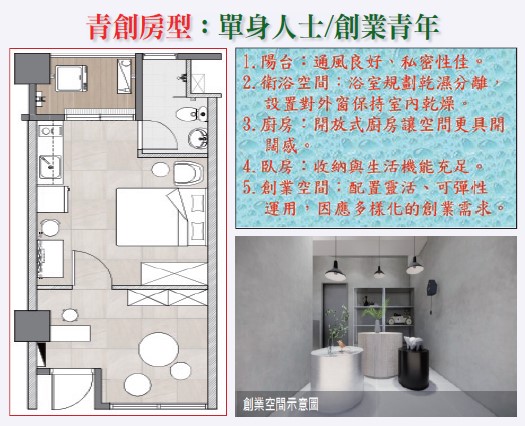 2.青創房型─協助青年創新產業紮根萌芽,設計櫥窗廊道、共享辦公室,創造西屯區創業基地。