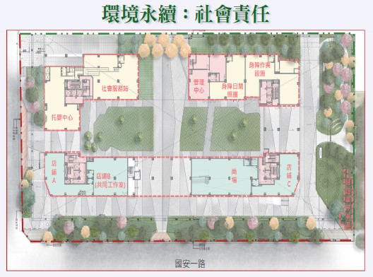 本案設置社會服務站、身心障礙服務措施、托嬰中心等社會服務空間,以及設置店鋪、共同工作室、商場等商業空間,藉以吸引人群引入社區活動、商業行為等,讓民眾自由的進出基地中,打破住宅禁止進入的觀念,形成地面開放式的社會住宅空間,創造美好的生活經驗。
