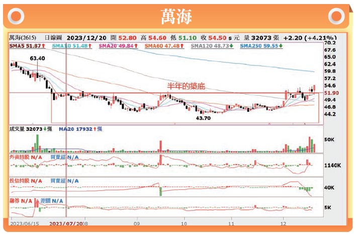 既然長榮先行、陽明隨後,那麼萬海有沒有機會呢?萬海截至12月20日收盤,單月上漲16.7%,漲幅落後陽明與長榮,主要的關鍵就是今年第一季長榮跟陽明都賺錢的情況下,萬海單季虧損-0.75元,對於菜籃族的感受來說,同樣是面對運費下跌的產業環境,怎麼長榮跟陽明可以賺錢,偏偏萬海賠錢,這對習慣跟風同族群的追漲買盤來說,無疑是踩到地雷的感覺,自然在這波的反彈上,就會比較擔心套牢。