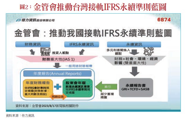 在上市櫃公司的管理,金管會是遵循國際永續準則(見圖二)。IFRS在2021年底成立ISSB組織,掌管永續準則的部分。ISSB在2023年6月26日全世界公布正式的國際永續準則版本S1,與永續相關的財務資訊揭露一般的規範。