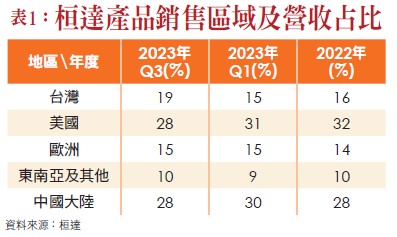 桓達產品銷售美洲、歐洲、亞洲都有,美洲以美國為主,亞洲包括台灣、東南亞、中國大陸。全球營收區域占比,2022年、2023年Q1、2023年Q3分別如表一。