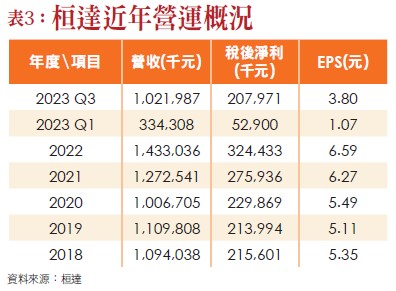 桓達自2019年起至2022年稅後淨利逐年成長,2022年營收、稅後淨利雙雙創高,且EPS也創歷年新高。2023年則有減緩現象(表三)。
