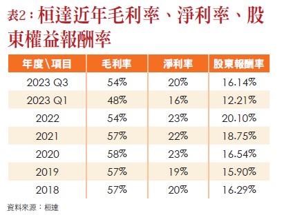2018~2022年各年度毛利率介於54%~58%之間。2023年Q3毛利率54%與2022年毛利率相當。