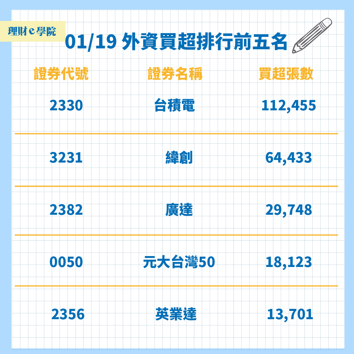 外資19日買超排行榜第一名為台積電(2330)買超11萬2455張,第二名為緯創(3231)買超6萬4433張,第三名為廣達(2382)買超2萬9748張,第四名為元大台灣50(0050)買超1萬8123張,第五名為英業達(2356)買超1萬3701張。