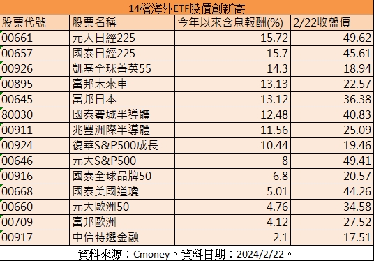 法人觀察,在台掛牌的海外ETF中,共有14檔在昨天(2/22)站上歷史新高價,進一步細看這14檔海外ETF今年以來含息報酬表現,前五強分別為元大日經225(00661)的15.72%、國泰日經225(00657)的15.7%、凱基全球菁英55(00926)的14.3%、富邦未來車(00895)的13.13%、富邦日本(00645)的13.12%,其中又以00926入手價在20元以下最為親民。