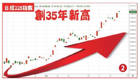 目前市場預期今年下半年聯準會(Fed)將降息而且又逢美國總統大選,強力貨幣釋出(印鈔機啟動)及政策必然作多,理性預期多頭行情再起,從去年第四季機構投資人就開始作多卡位,我們先來看近期美國四大指數的表現:2/23道瓊指數再創歷史新高39282點(詳圖一)、NASDAQ創兩年多新高16134點、S&P500再創歷史新高5111點、費城半導體再創歷史新高4709點;德國NQ指數2/22創高1291點、法國CAC指數2/23創高7976點、日經225指數2/26創高39388點(詳圖二),皆顯示國際資金行情已全面展開!國際熱錢去年第四季開始湧進台灣,外資11~12月大買台股達4,201億,一月份外資賣超-17億,二月截至2/26外資買超1, 252億,加權指數於2/23創歷史新高19012點,櫃買指數同日創高248.82點,顯示外資持續作多台股!