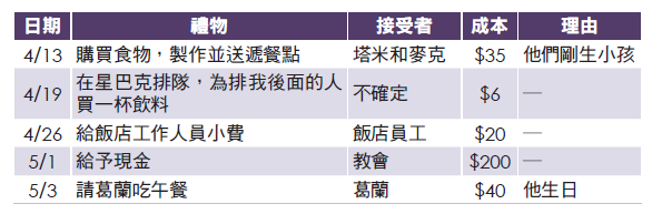 要能追蹤它,你只需要一本筆記或一張簡單的試算表。對於我們來說,只需記錄日期、付出的類型、受贈者、成本(或價值)和原因,並在成本欄底部計算加總。
