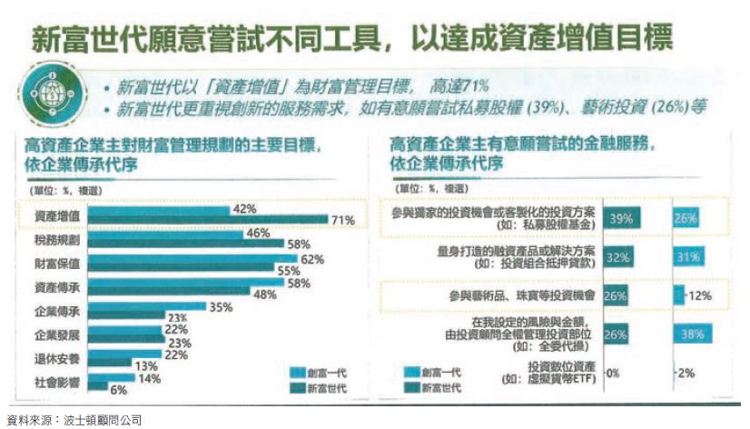 對於接班的新富世代,特別期待金融機構提供資產增值工具、社會財富需求及加值服務,高達71%的新富世代以「資產增值」為財富管理目標,更重視創新理財服務,例如私募股權基金、藝術投資。