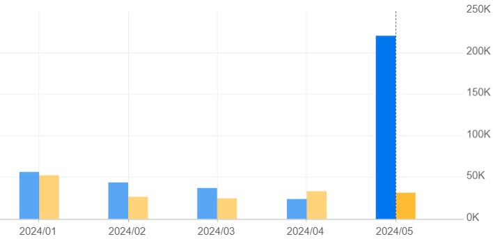 ▲ 皇家美食每月營收,藍色為本期,黃色為前期(資料來源:XQ全球贏家)