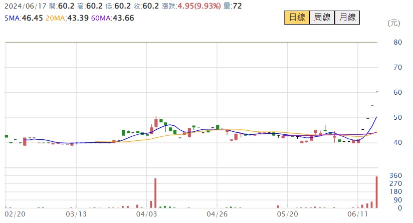 今年五月皇家美食收購家城公司(漢堡王代理商),皇家美食總經理黃于嘉9日表示,5月完成交割後,全台現有漢堡王90多家分店每月共1億多元的營業額,將併入皇家美食營收。皇家美食5月最新營收為2.2億元,創40個月新高,月增803.9%,年增586.69%;1到5月累計營收為3.8億元,年增125.30%。今(17)日股價方面,皇家美食已連跳四台階,漲停價60.2元,漲幅9.85%,目前成交量352張。