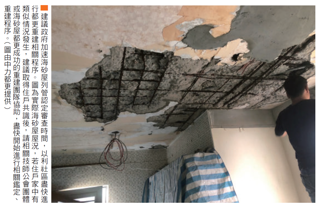 但是在最前面海砂屋資格審查的這個階段,反而讓地主要等待一年左右的時間,並且在尚未取得資格之前,很多都更程序也都無法正式進行,這段期間內地主能做的就只能等待。而在地震頻傳、地主焦急的心情下,建議建管處在審查是否通過列管時,若經相關技師公會團體認定屬非常嚴重之海砂屋,則應盡快讓海砂屋列管通過,避免後續發生大地震造成更多住戶傷亡。