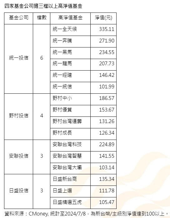 統一投信不僅高淨值基金檔數最多,還包辦股票型基金淨值前三名。「淨值王」統一全天候基金7/8淨值高達335.11元,是唯一一檔淨值超過300元的基金。居后冠的統一奔騰基金,淨值達到271.90元,也是科技股基金淨值王。季軍為淨值234.55元的統一黑馬基金,與統一奔騰基金同為少數規模達到百億等級的台股基金。而統一龍馬基金也以207.73元的淨值,躋身淨值200元基金俱樂部。統一投信的高淨值基金還有統一經建及統一統信基金,淨值分別為146.42及101.99元。