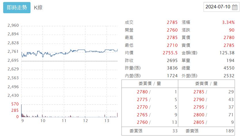 特殊應用IC(ASIC)設計服務廠世芯-KY(3661)近日營收亮眼,股價也隨之反彈,今日世芯開盤價2760元,盤中股價一路震盪向上,最終收盤價2785元,漲幅3.34%,今日成交量4562張。