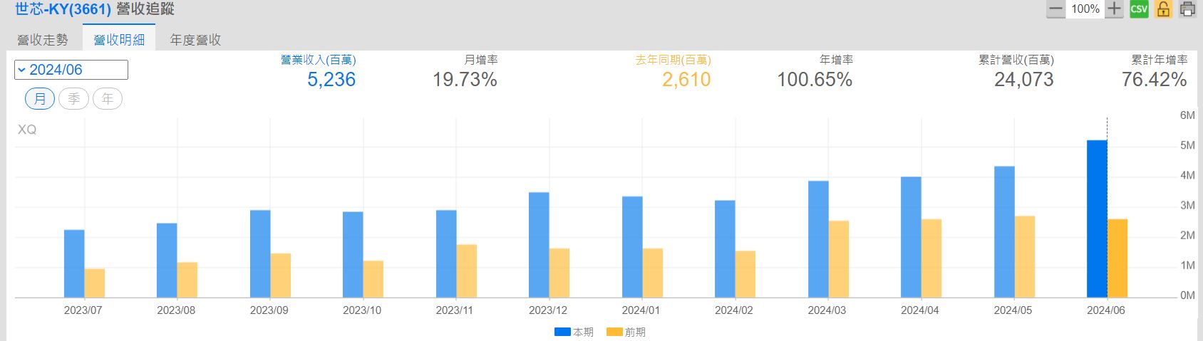 世芯公布6月最新營收為52.3億元,創40個月新高,月增19.73%,連續4個月成長,年增100.65%,連續26個月成長;上半年累計營收為24億元,年增76.42%。最新EPS為15.83元,季增5.09%,連續7季成長,創40季新高,近四季EPS為50.33 元。