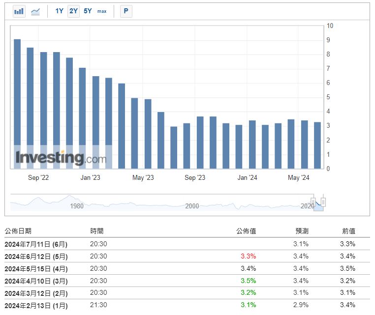 美國5月通膨指標如消費者物價指數(CPI)為3.3%,較4月的3.4%低,可看出通膨降溫程度低於預期,今日晚上公布的六月數據若也低於預期,將會提升降息的機率。