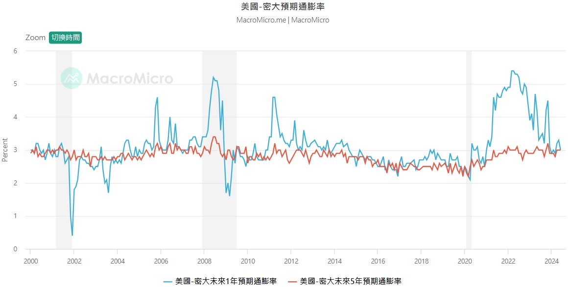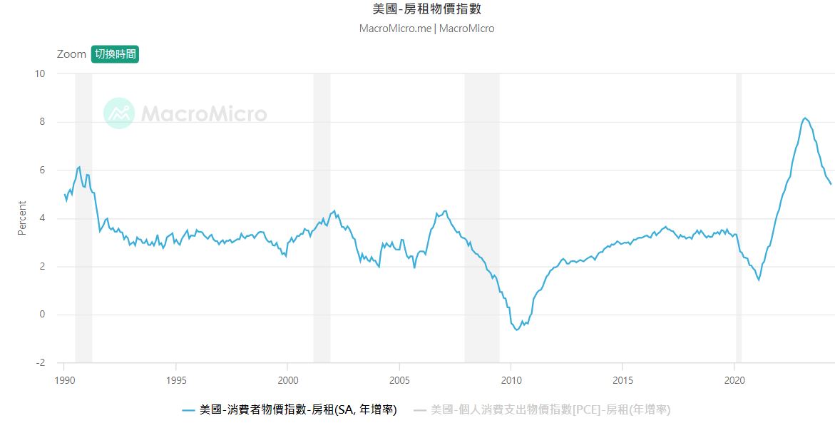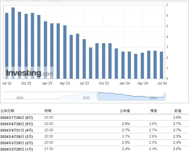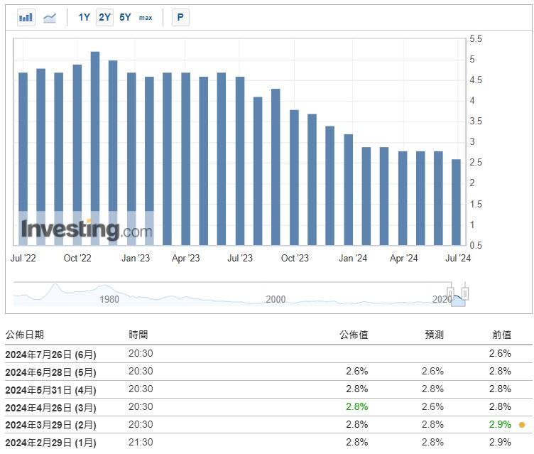 美國5月個人消費支出物價指數(PCE)為2.6%,同樣低於前月的2.7%,顯示通膨降溫。PCE指數調查對象更廣,且PCE的權重更新頻率比較快,使其能更準確反映消費者行為的變化,這也是為何FED近年在調整利率政策走向時,會更傾向以PCE當作參考指標。