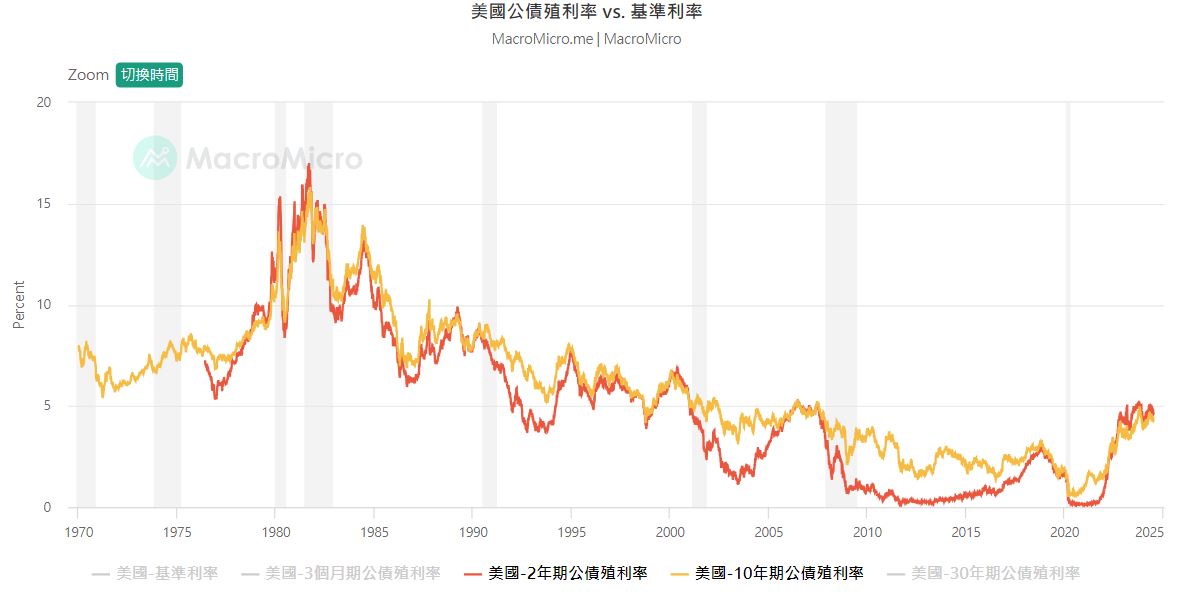 自2022年以來殖利率一直呈現「倒掛」,投資人悲觀看待短期經濟展望,才會偏好將資金轉入長期債券,導致長期殖利率下降,不過長短期利差已逐漸下將,開始對短期市場恢復信心。