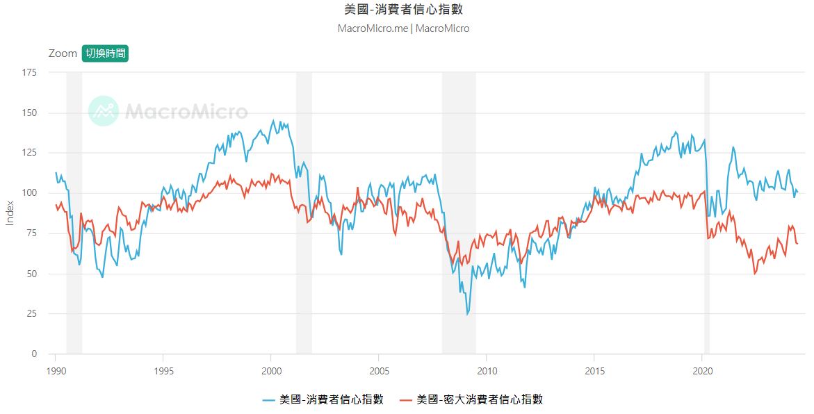從資料來看,美國預期通膨率雖然下降,消費者信心指數卻無提升,民眾對未來發展並無特別看好。