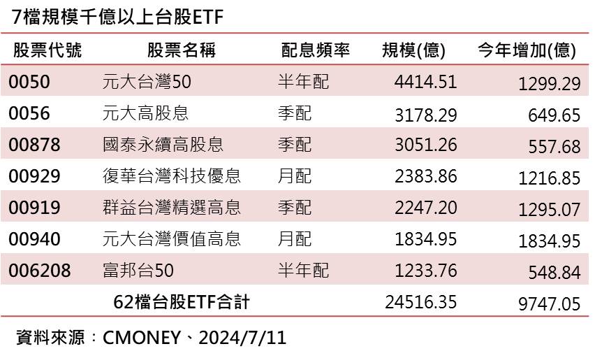 大盤頻創新高,而深受投資人喜愛的台股ETF規模也水漲船高同步來到2.45兆創下新猷,台股ETF規模今年來增加9747.05億,檔數也新增6檔至62檔,其中更有七檔規模超過千億,分別是0050元大台灣50、0056元大高股息、00878國泰永續高股息、00929復華台灣科技優息、00919群益台灣精選高息、00940元大台灣價值高息、006208富邦台50;這七檔今年規模共增加7402.34億,佔了總增加的近八成,而台股ETF七千金中高息型就佔了五檔,更顯示出高息ETF持續受投資人青睞。