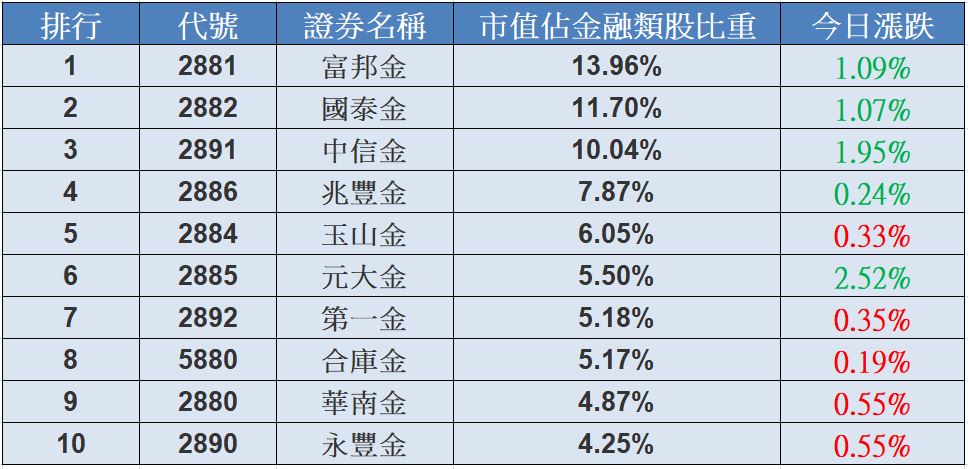 ▲ 市值佔金融類股比重前十大個股今日漲跌(資料來源:台灣指數公司)