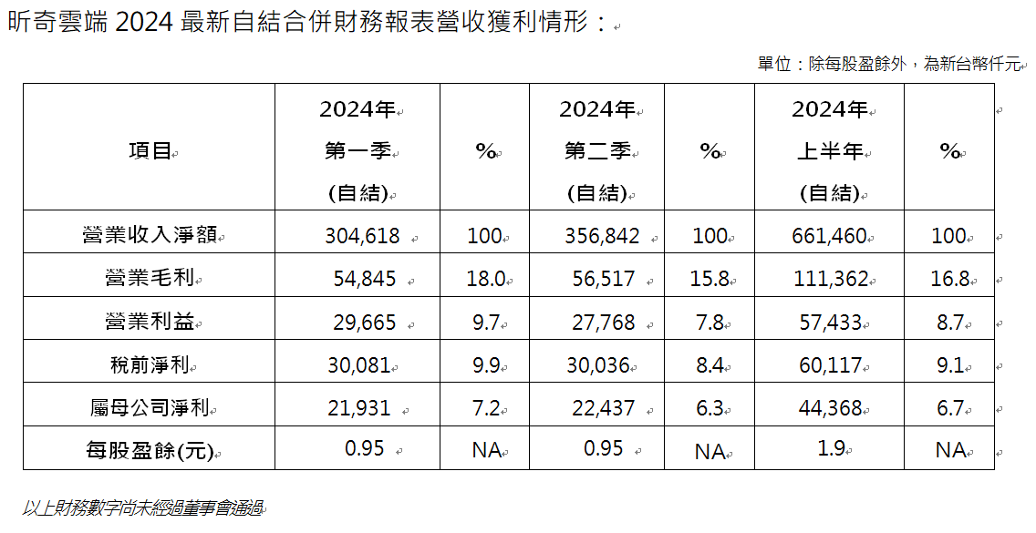 昕奇雲端科技股份有限公司(7747)今(16)日公布掛牌興櫃後首張成績單。受惠於海外市場高速成長,營收續創新高,成長動能持續強勁。2024第二季自結合併營收約新台幣3.568億元,屬母公司淨利約新台幣2,244萬元,每股盈餘為新台幣 0.95元。與去年同期相較,2024年第二季營收增加了47.4%,屬母公司淨利與每股盈餘分別增加了100.3%與97.9%。利潤率表現方面,2024年第二季毛利率15.8%、營業利益率8.4%、稅後淨利率6.3%,若與去年第二季毛利率 16.8%、營業利益率6.5%、稅後淨利率4.6%相比,雖今年第二季係受到網通資安大型專案之影響稀釋毛利率,但營業利益率與稅後淨利率皆因運營商模式奏效與營運費用控管得宜,相較去年皆有顯著提升。