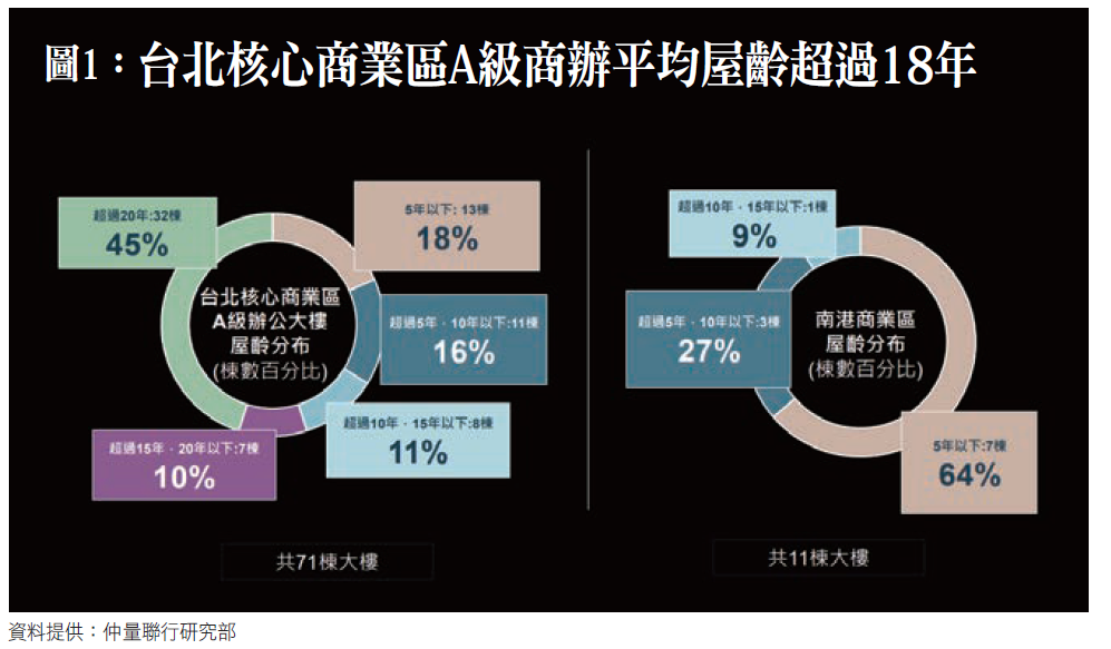 仲量聯行日前舉辦2024年第二季季報記者會,發布《台北市A辦供給現況及升級趨勢報告》,盤點台北市包含自用及租賃之82棟A級商辦屋齡現況,指不少商辦屋齡都已超過十八年,並針對這些大樓在申請綠建築標章的現況進行了解(圖一)。