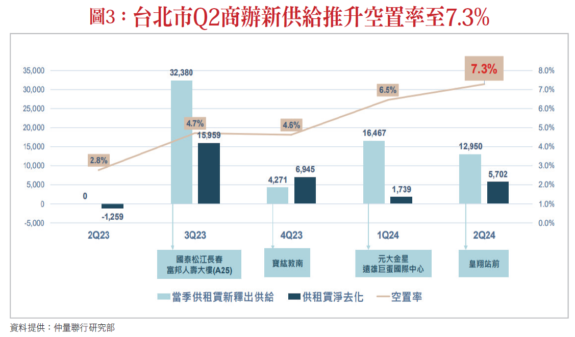 同時由於本季新供給約釋出1.3萬坪,空置率進一步推高至7.3%,連續兩季度呈現上升走勢。雖空置率持續上升,核心商業區各分區市場淨去化量皆為正向,顯示A辦市場仍在吸納自B辦或非核心商業區搬遷之需求(圖三)。
