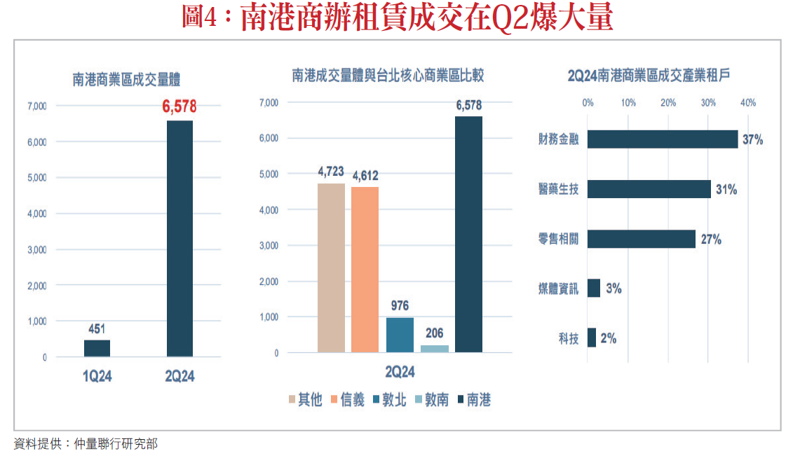 游淑芬指出,在台北市的另一端,南港商業區A級辦公室租賃本季成交量為6,578坪,相當於台北核心商業區62%之成交量體(圖四)。