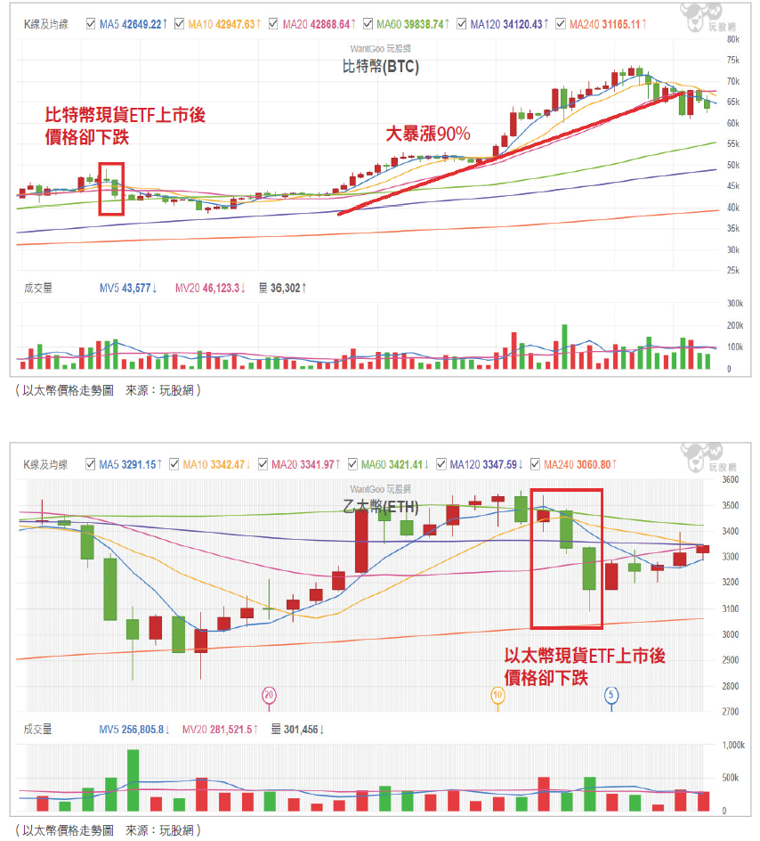 從價格走勢圖來看,ETF上市後的比特幣和以太幣價格都先經歷了一段下跌,而這段下跌的賣壓,有很大一部份可能來自灰度(Grayscale)基金(GBTC)的拋售,灰度基金是早於ETF上市的一款封閉型基金,是以所持比特幣價格為市值基礎的投資基金,吸引了許多選擇間接投資比特幣的投資者,在當時BTC ETF上市後,灰度基金也同時轉型為比特幣現貨ETF,而原本GBTC龐大的投資者因費率過高,紛紛選擇出售手上的GBTC,轉為買進其他支費率較低的比特幣現貨ETF,此過渡期就會形成一股強大的賣壓,造成原先預期ETF上市後會吸引資金大量湧入,而一飛衝天的股價,變成得先經過一段下跌後,才能開啟新攻勢。至於這次的ETH現貨ETF就目前觀察來看,也是同樣的情形,若真的歷史重演,以太幣很可能跟比特幣一樣,在ETF上市後兩周,迎來一波大暴漲。
