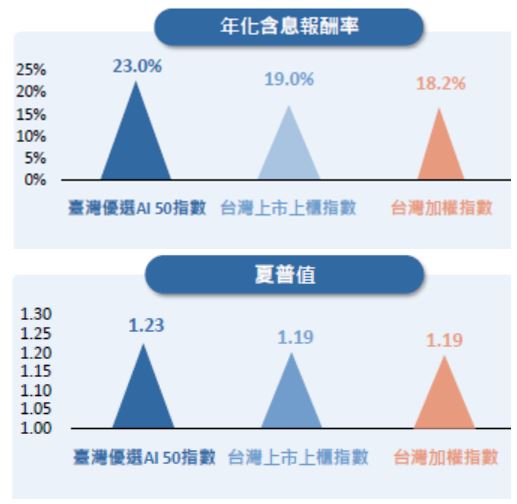 回測凱基優選台灣AI 50 ETF 基金(證券簡稱:凱基台灣AI 50,證券代號:00952)所追蹤指數-臺灣指數公司特選臺灣上市上櫃FactSet優選AI 50 指數(以下簡稱臺灣優選AI 50指數)2016年以來表現,可以發現相較於台灣加權指數或是台灣上市上櫃指數,凱基台灣AI 50(00952)所追蹤的臺灣優選AI 50指數,不論是年化含息報酬率或是夏普值表現都更為突出(圖)。