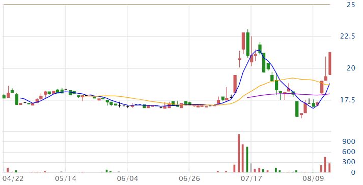 此波漲勢始於週一(8/12)公布營收,日成7月最新營收為1.8億元,月增32.05%,年增100.16%,連續 4 個月成長;今年1到7月累計營收為8.2億元,年增43.49%。