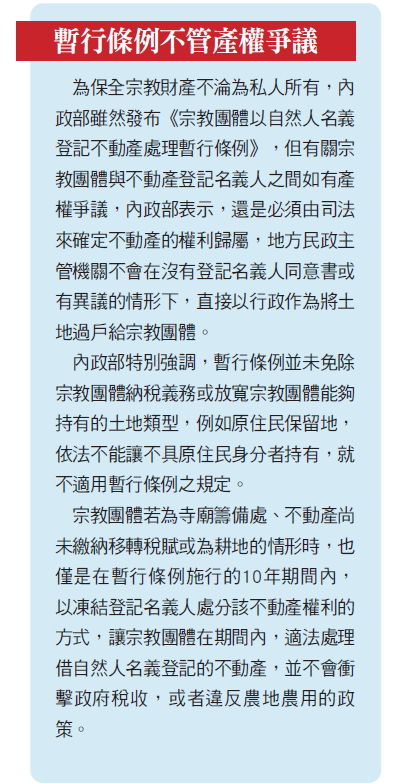 內政部說明,為保全宗教財產不淪為私人所有,《宗教團體以自然人名義登記不動產處理暫行條例》透過較簡便的行政程序,對無私權糾紛的宗教不動產進行權利歸屬審認。
