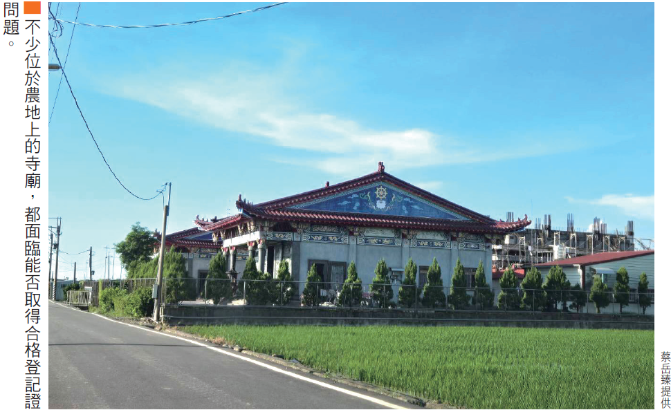 此外,由於建地價格太貴,神明朝向農地蓋廟。蔡岳臻說,由於建地價格日漸高漲,而蓋廟往往需要大面積土地,因此中南部就存在著許多農地宮廟,由於寺廟建物是蓋在農地上,但依《農業發展條例》規定,農地僅能做「農業使用」,除非是該筆農地透過申請特定目的事業用地變更為宗教用地後,才有機會取得寺廟建物保存登記以及寺廟登記。
