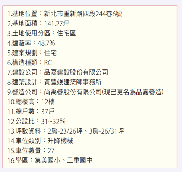 本建案位於三重區重新路四段244巷的危老改建項目,基地總面積為141.27坪,涵蓋10戶房產,包括一塊空地、一棟透天厝、一棟八戶之四層樓老舊公寓,所有建物屋齡均超過43年。